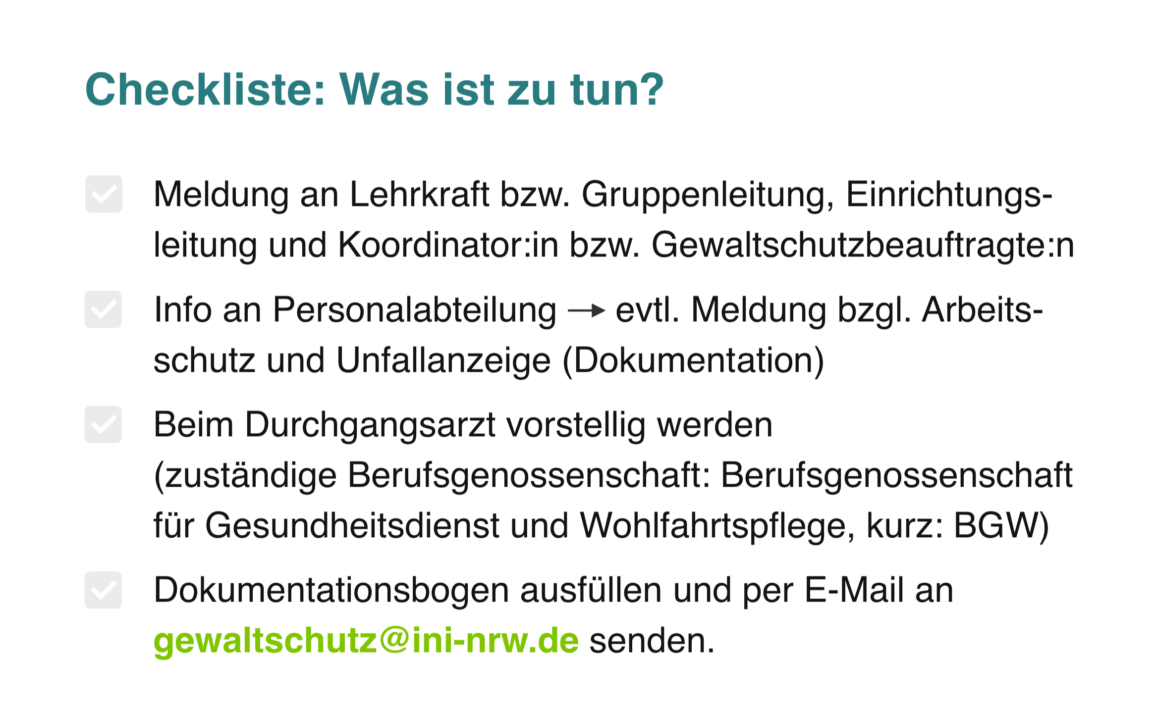 Bitte senden Sie den ausgefüllten Dokumentationsbogen nach einem Gewaltvorfall, gleich welcher Art, baldmöglichst an den:die Gewaltschutzbeauftragte:n (postalisch oder per E-Mail an: gewaltschutz@ini-nrw.de).